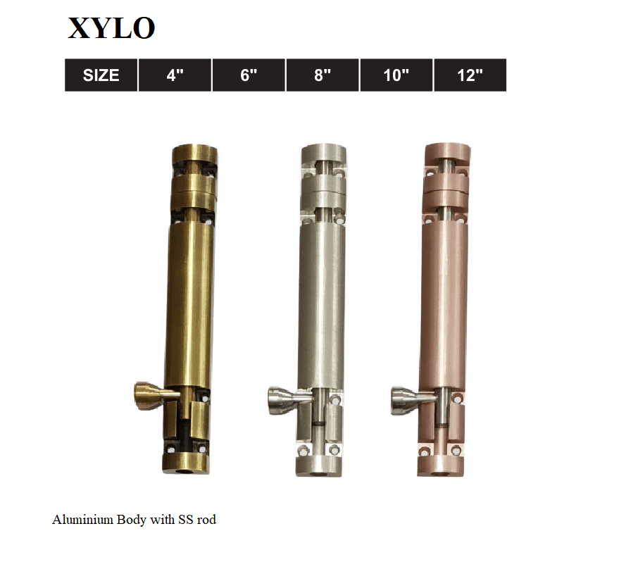 Xylo Tower Bolt Aluminium Body with SS Rod. Its available in Many Sizes and Many Finishes but mostly running colors are SS, Antique and Matt.
