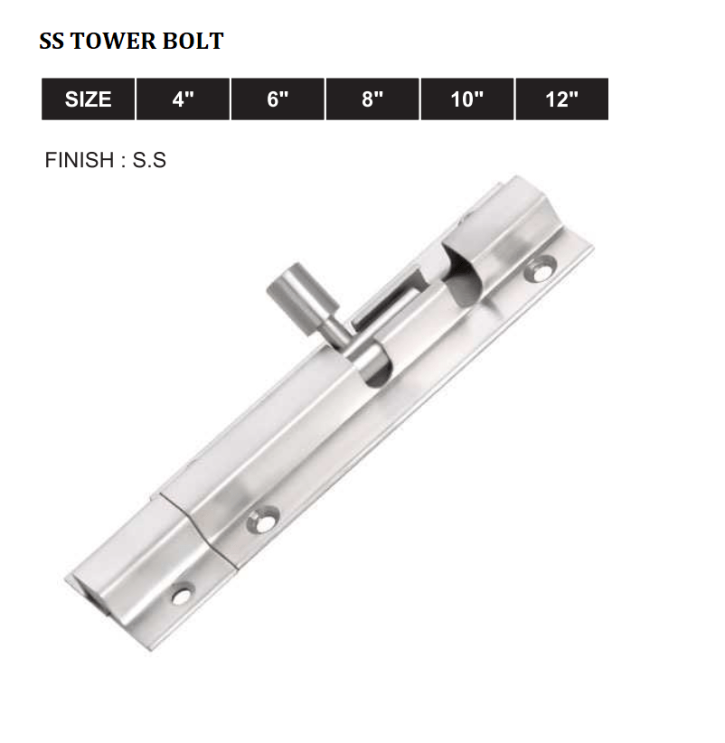 SS Tower Bolt SS Body with SS Rod. Its available in Many Sizes and Many Finishes but mostly running colors are SS and Matt.